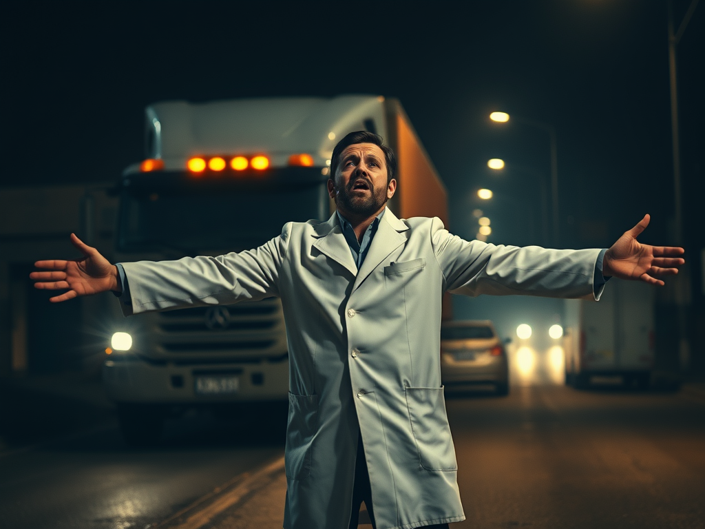 The doctor had come to rest, but the 18 wheeler had not. Smoke pouring from its tyres, the juggernaut screamed like a banshee as it slid down the road, its trailer spinning outwards and trying to jackknife the cab. Horns blared. Tyres squealed. The truck continued to slide.